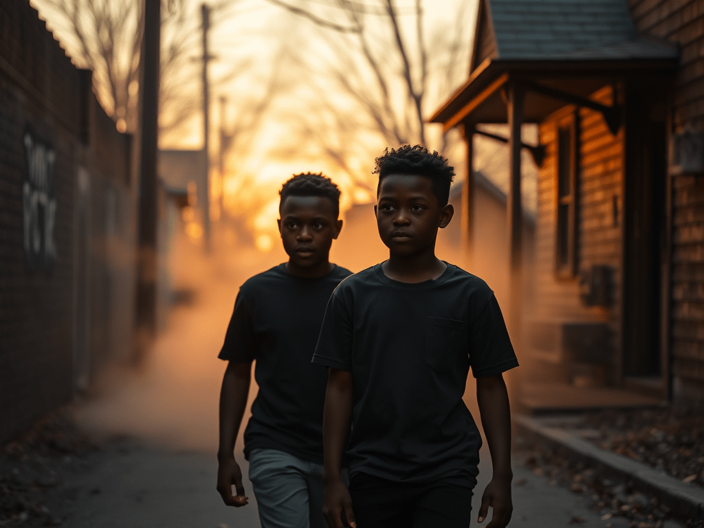 The air was cooler than usual, and a strange stillness hung over the neighborhood. Marcus couldn’t put his finger on it, but everything seemed off. The usual hum of activity—the muffled beats of rap music, the occasional shout or laughter from locals—was missing. In its place was an unsettling quiet, the kind of silence that made the boys’ footsteps sound too loud.